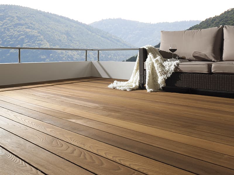 Лиственница имеет красивую текстуру и теплые оттенки, которые придают террасе уютный и естественный вид. Со временем древесина немного темнеет, приобретая благородный серебристо-серый оттенок, что добавляет ей шарма.