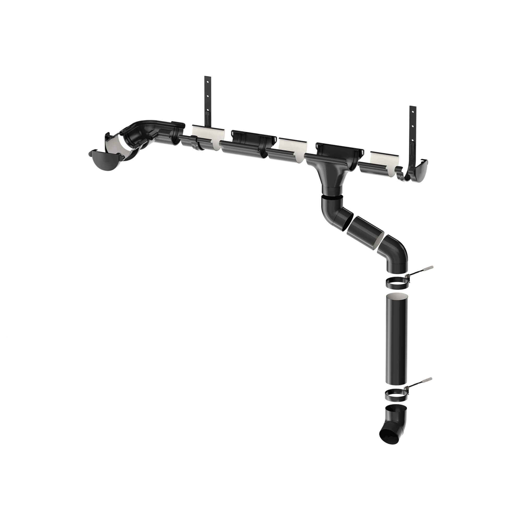 В состав системы входят все необходимые доборные элементы для организации полноценного отведения дождевой и талой воды с крыш и навесов.